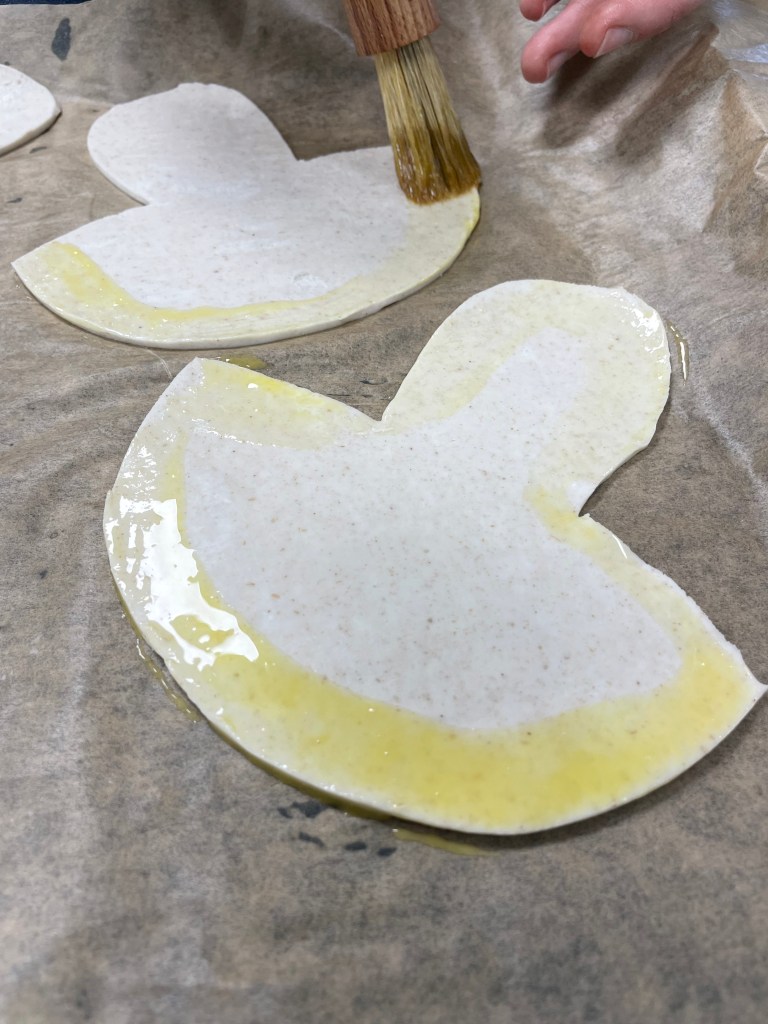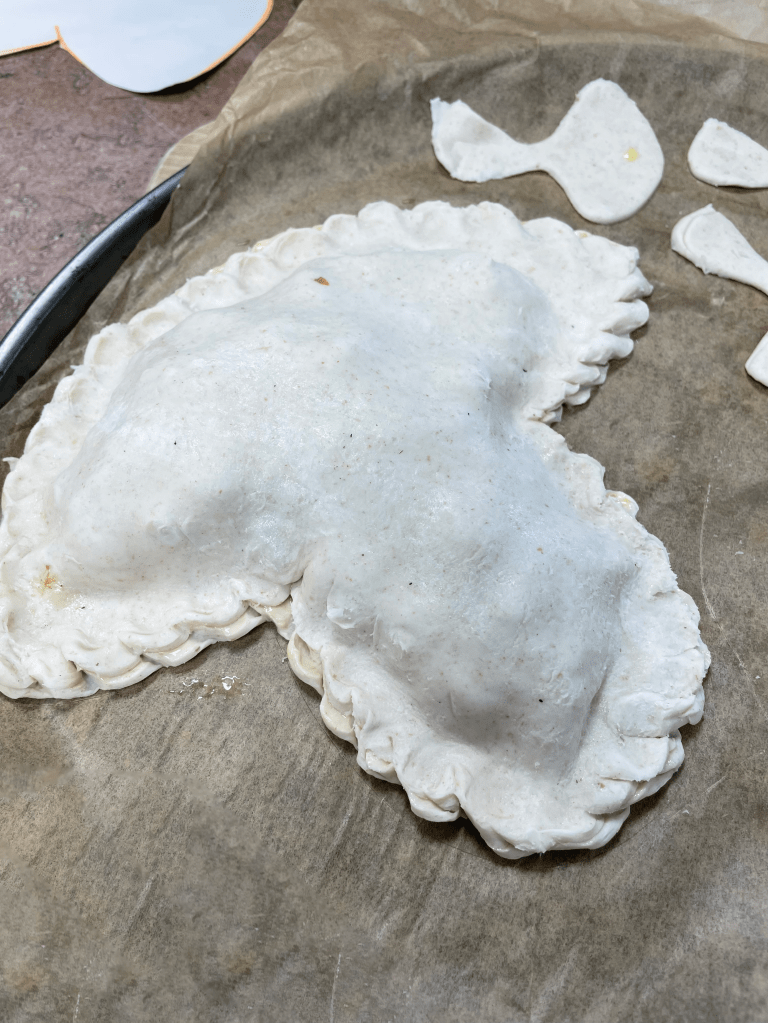 11. Garnir la moitié des pâtes, les recouvrir et les chiqueter pour fermer les tourtes, percer une « cheminée » et badigeonner d’œuf.