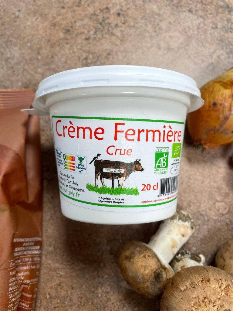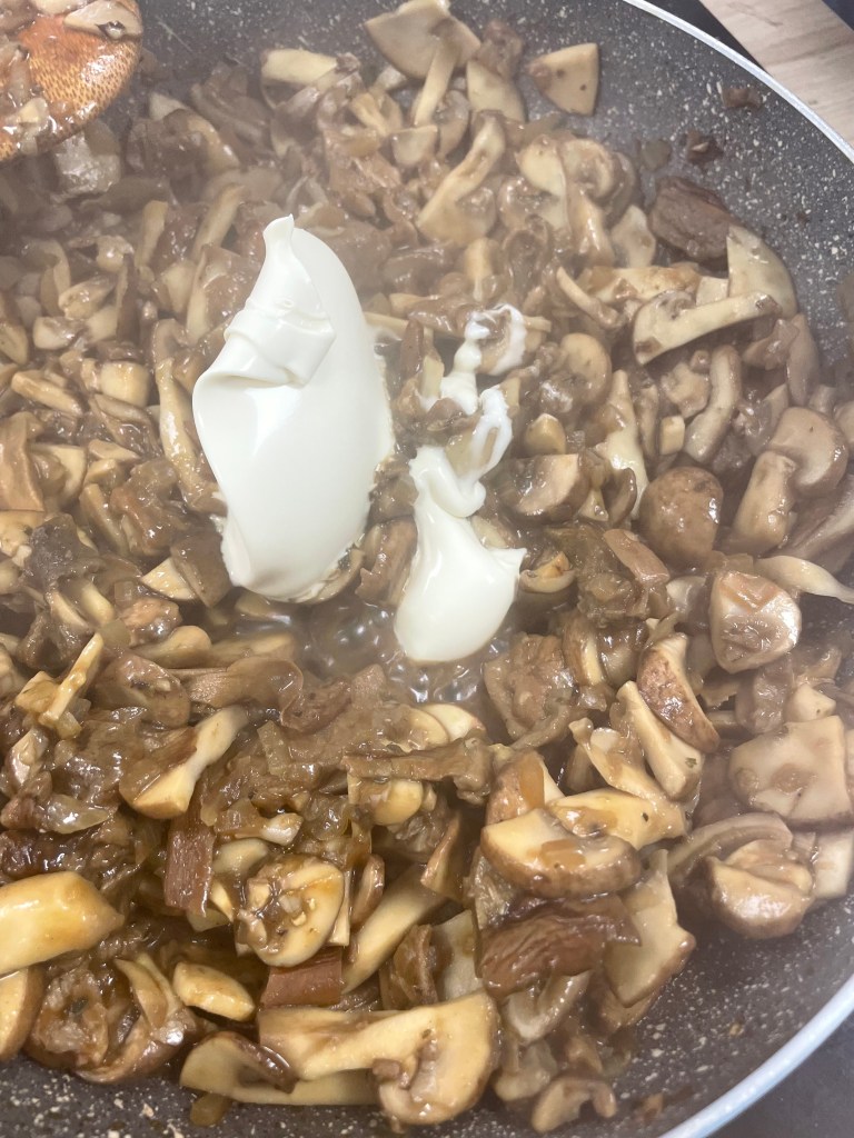Pour adoucir la préparation, nous avons simplement ajouté une belle cuillère de crème fraîche crue en fin de cuisson des champignons !