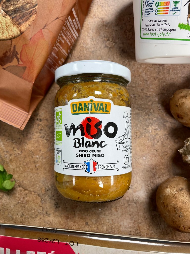 Notre miso blanc « jeune » (ou shiro miso) est fabriqué dans le sud-ouest de la France de manière artisanale d’après une recette traditionnelle à partir de soja français sans OGM. S’il s’utilise souvent dans des soupes ou des marinades, il se prête aussi à des recettes plus sophistiquées (comme un « Bourguignon » de champignons par exemple), mais aussi sucrées (cookies au miso et au chocolat blanc, cake au miso et au sésame).