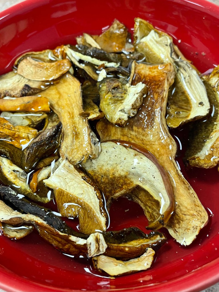 1. Réhydrater les cèpes dans de l’eau tiède pendant 30 minutes.