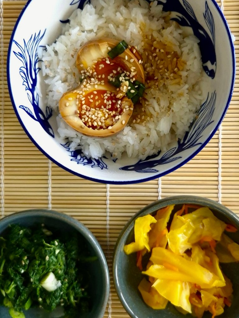 Pour le dressage des bols, un fond de riz rond ou thaï, un filet d’huile de sésame grillé, les œufs marinés coupés en deux et des graines de sésame. En accompagnement : les épinards, le kimchi, un bol de soupe de miso…