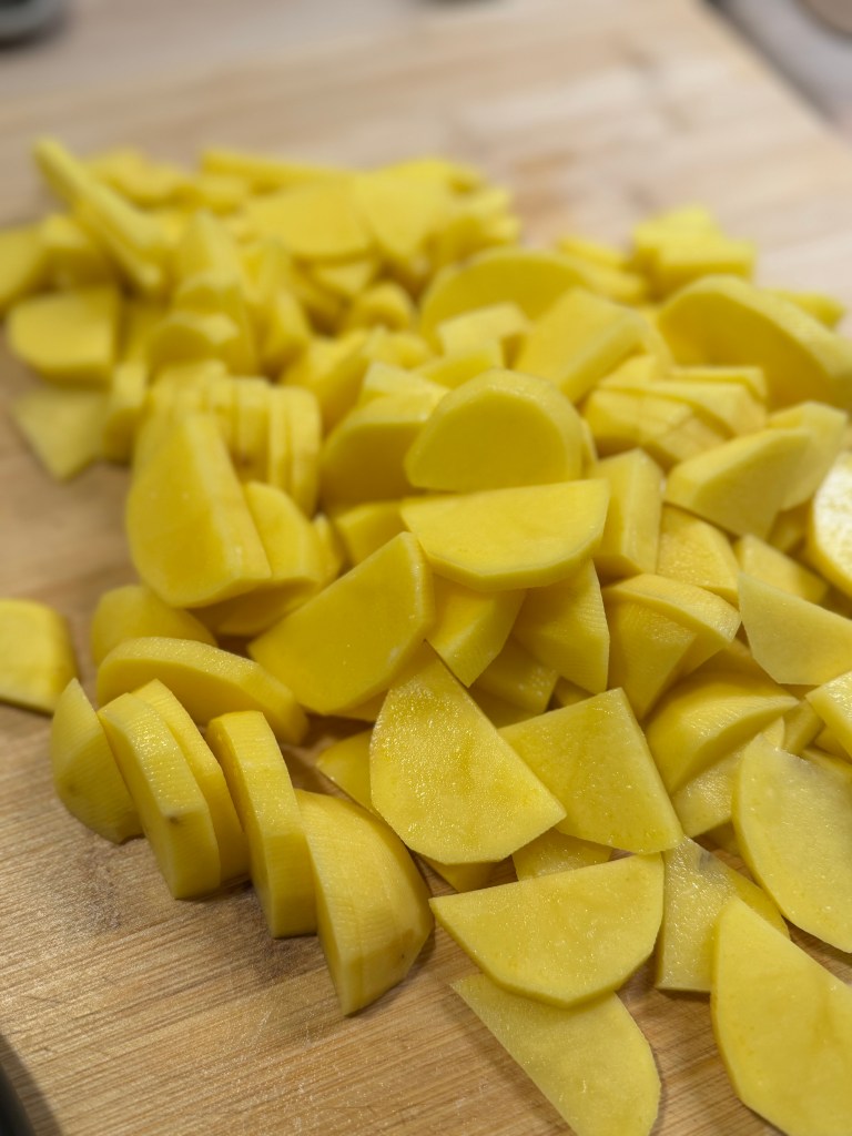 - Éplucher les pommes de terre, les laver et les couper en rondelles d’un demi-centimètre d’épaisser.