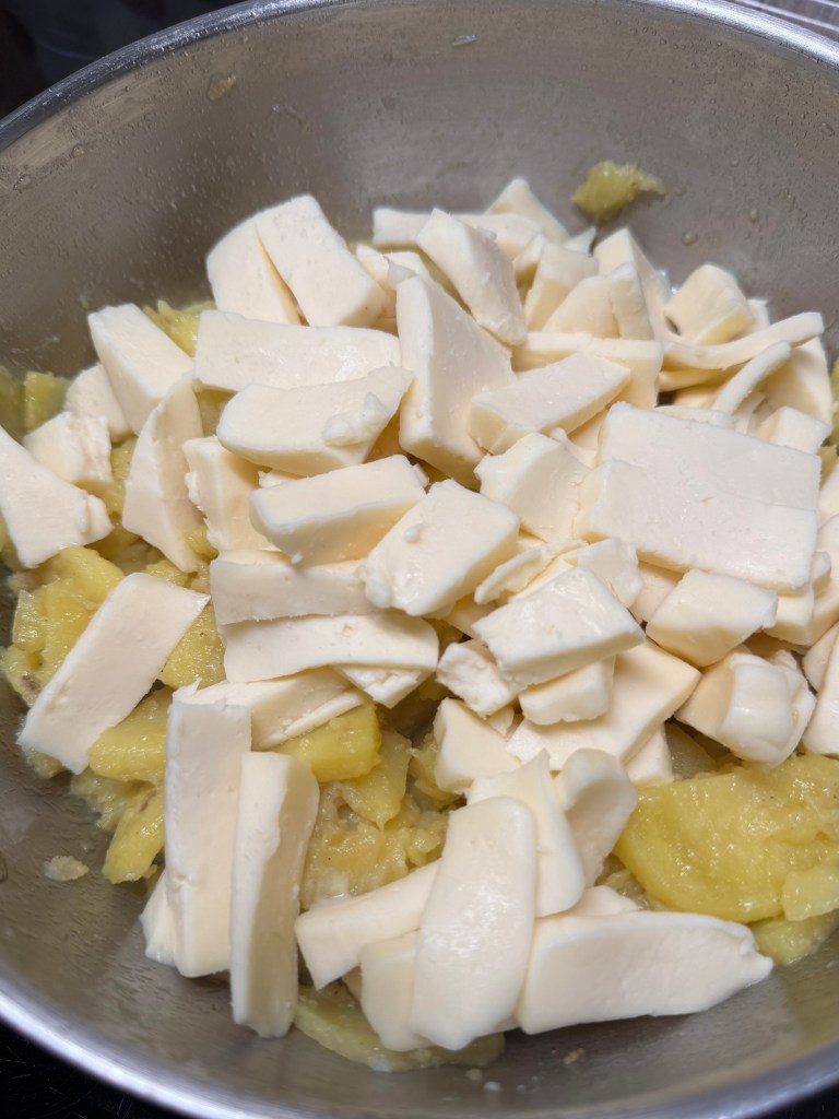 Lorsque les pommes de terre sont fondantes, vous pouvez ajouter la tomme fraîche coupée en lamelles : couvrez et laissez-la fondre au contact des pommes de terre chaudes.