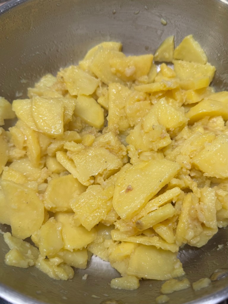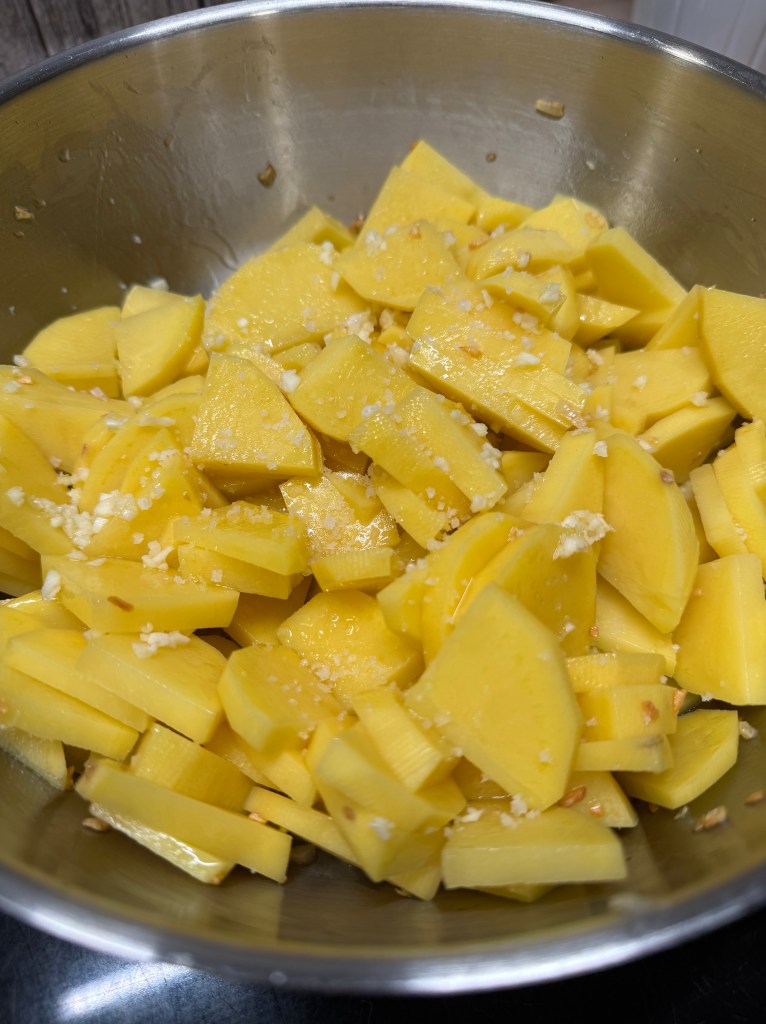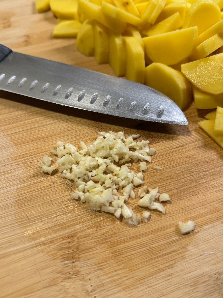 - Éplucher les gousses d’ail, les râper (ou les émincer finement) et les ajouter aux pommes de terre. Saler et poivrer.