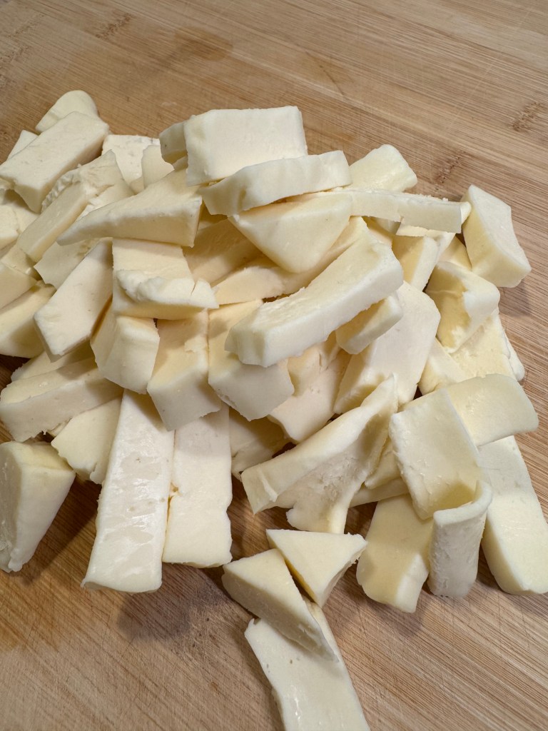 - Couper la tomme fraîche en lamelles, les disposer sur les pommes de terre et couvrir 5 minutes.