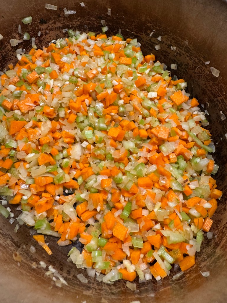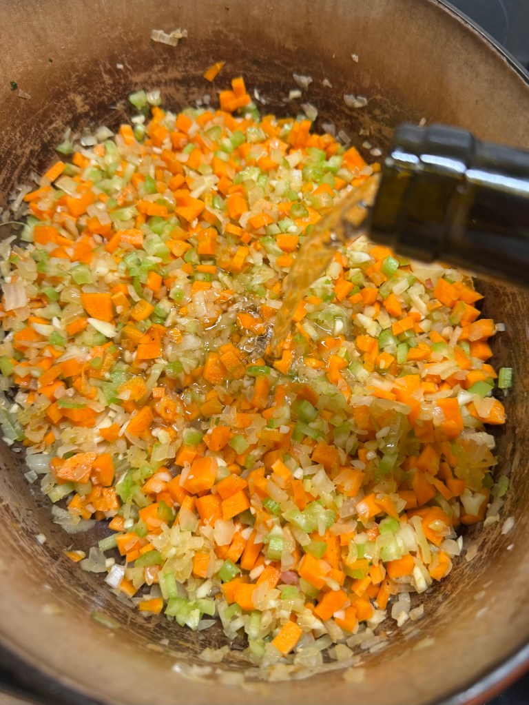 - Ajouter les carottes, le céleri et l’ail, mélanger et laisser cuire quelques minutes avant de déglacer avec le vin blanc.