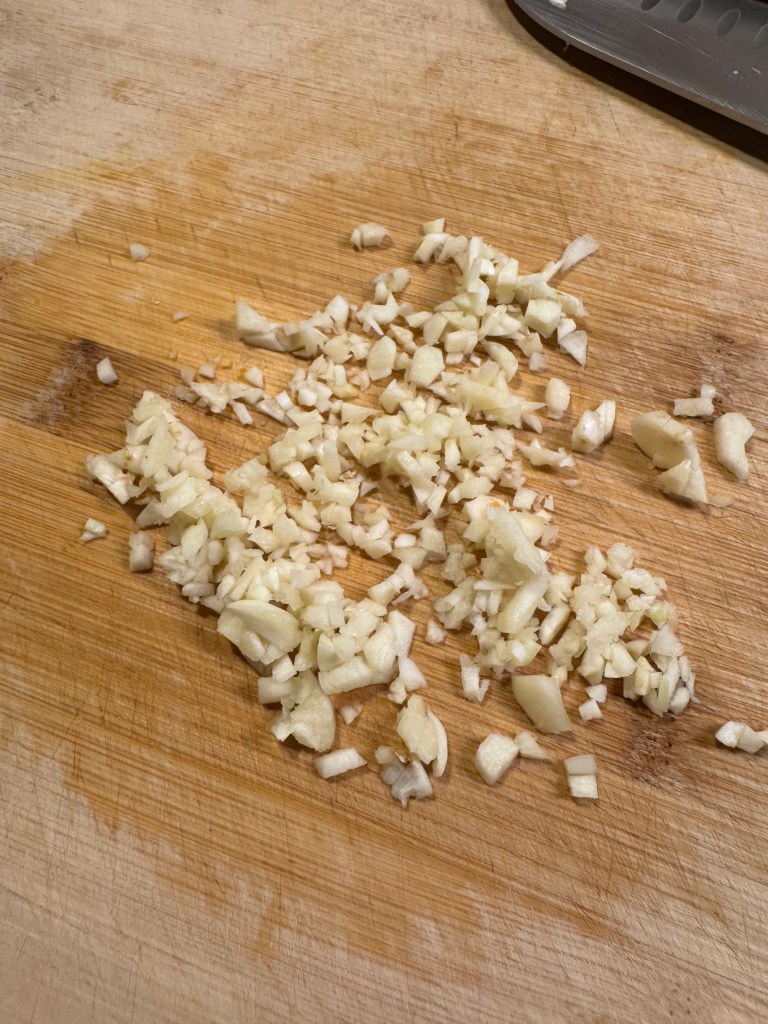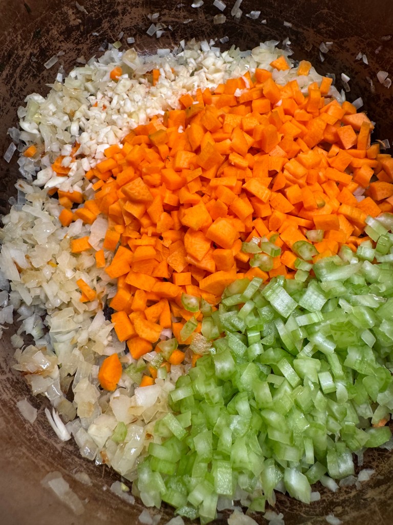 - Éplucher les oignons et les carottes, laver les branches de céleri et couper le tout en brunoise. Éplucher et émincer les gousses d’ail.
