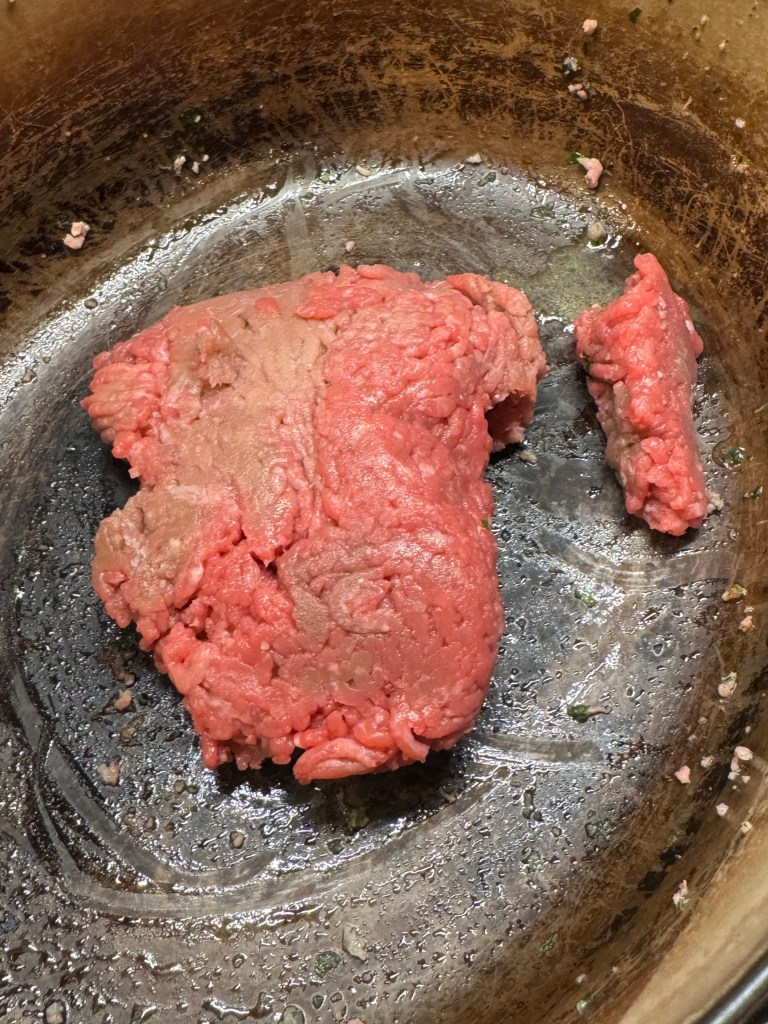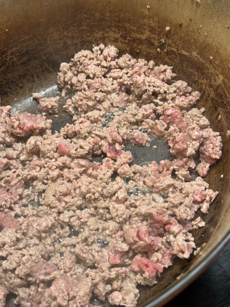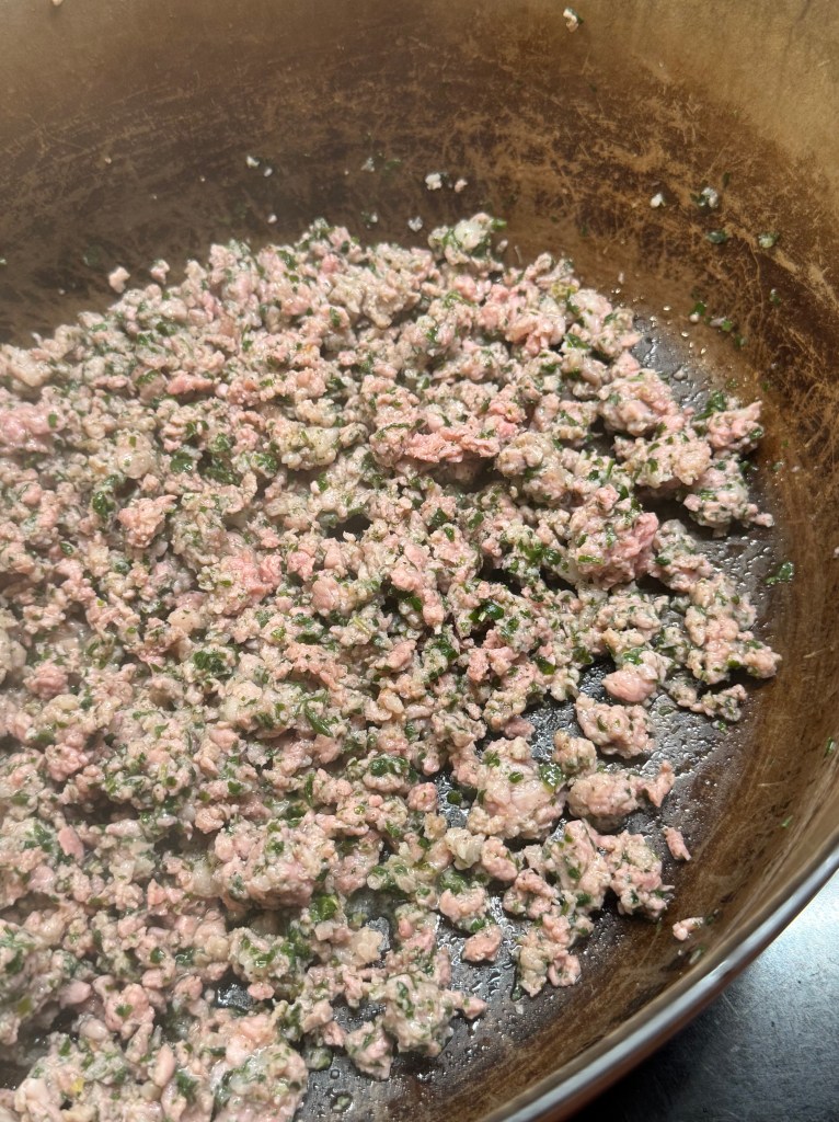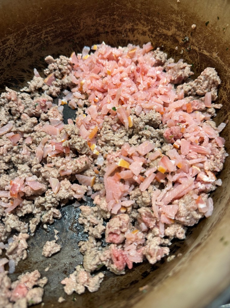 - Dans un faitout, faire rissoler tour à tour dans l’huile d’olive la farce puis le bœuf haché.