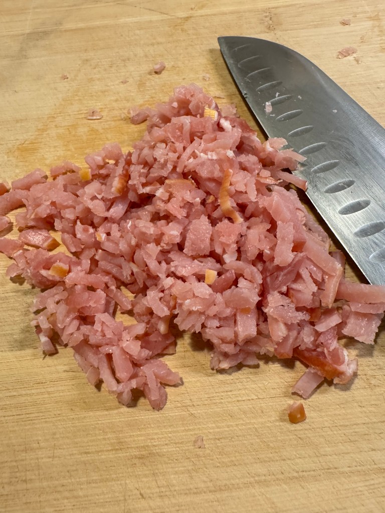 - Émincer le bacon, l’ajouter à la viande et laisser cuire quelques minutes. Débarrasser et réserver à couvert.
