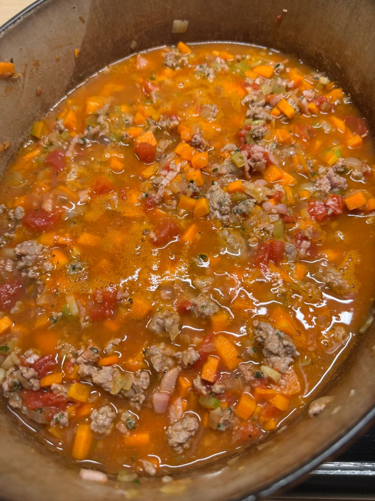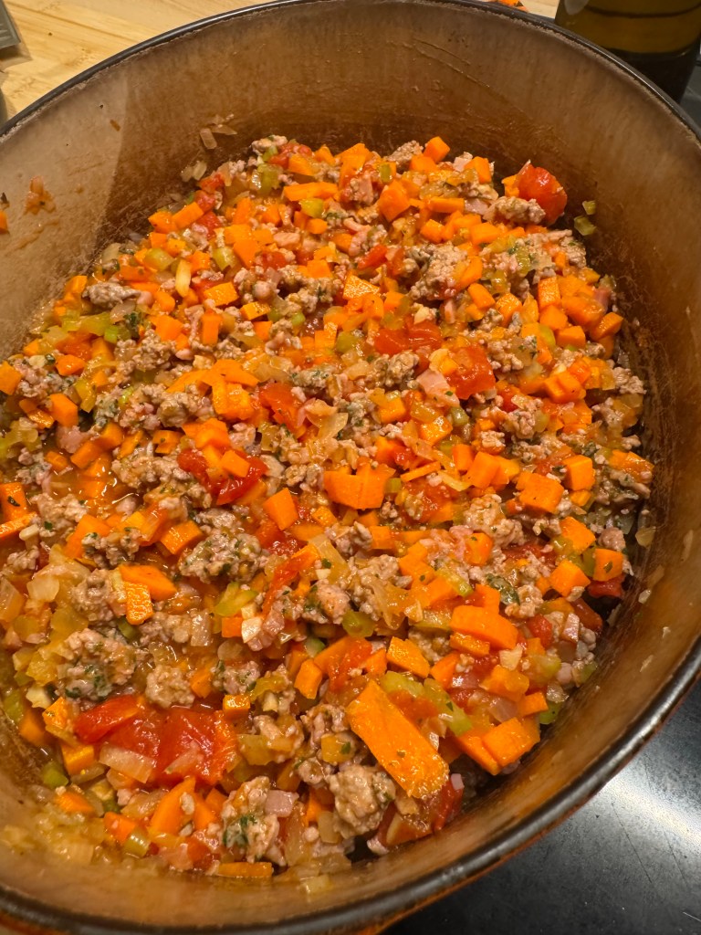 Dans le ragù alla bolognese, la viande est d’abord cuite à part dans un faitout pour en extraire les sucs, dans lesquels les légumes vont ensuite rissoler.