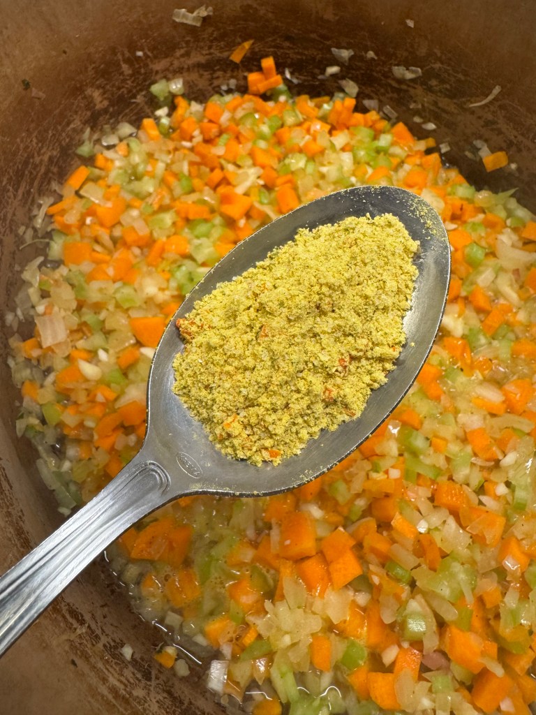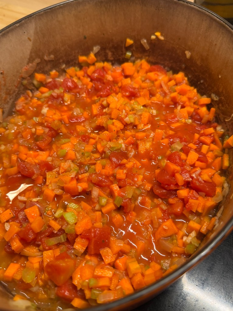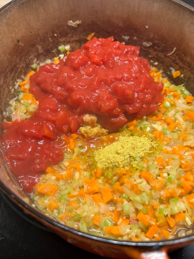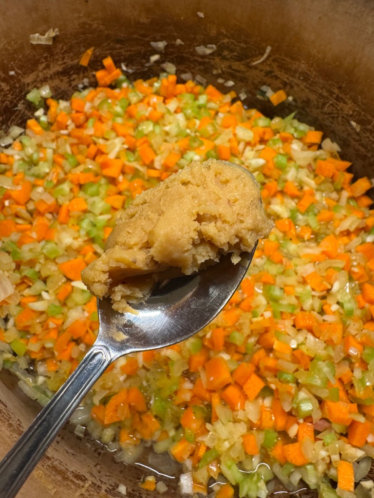 - Incorporer le bouillon de légumes en poudre, le miso, les tomates concassées et le bouillon de poule.