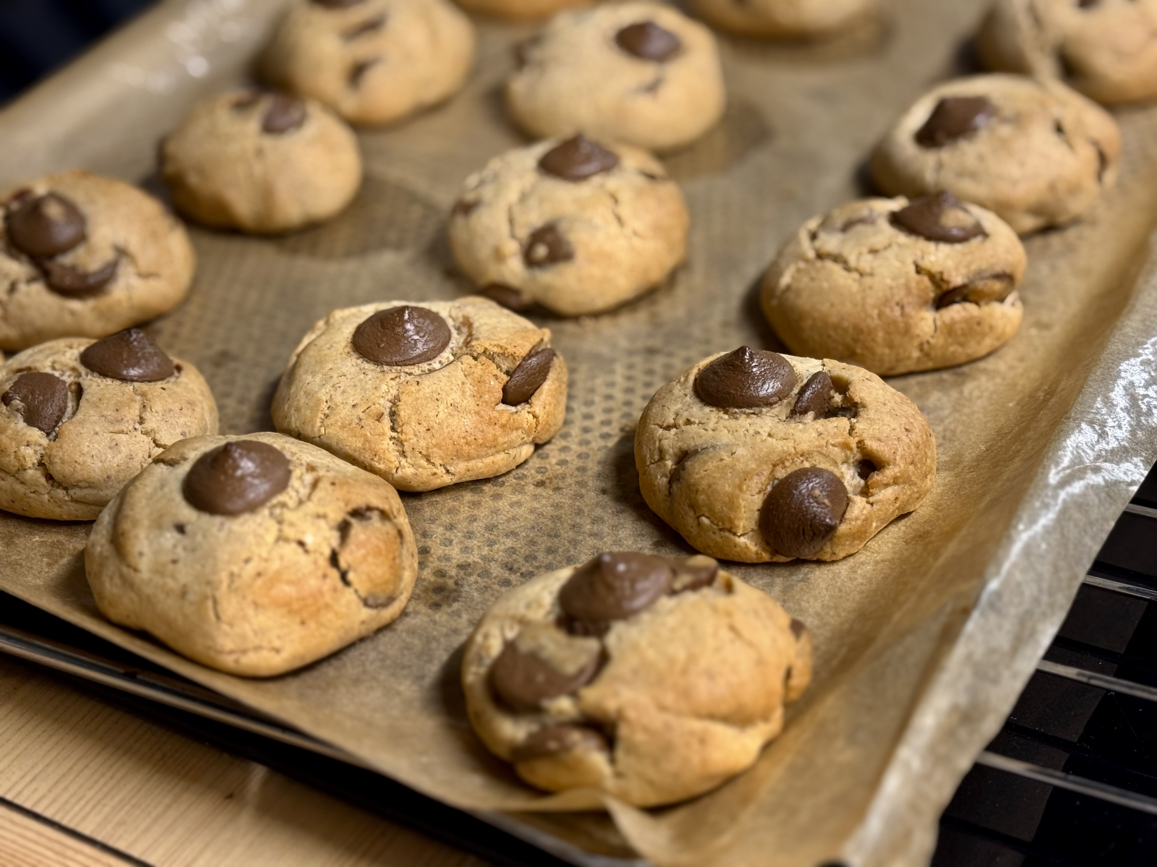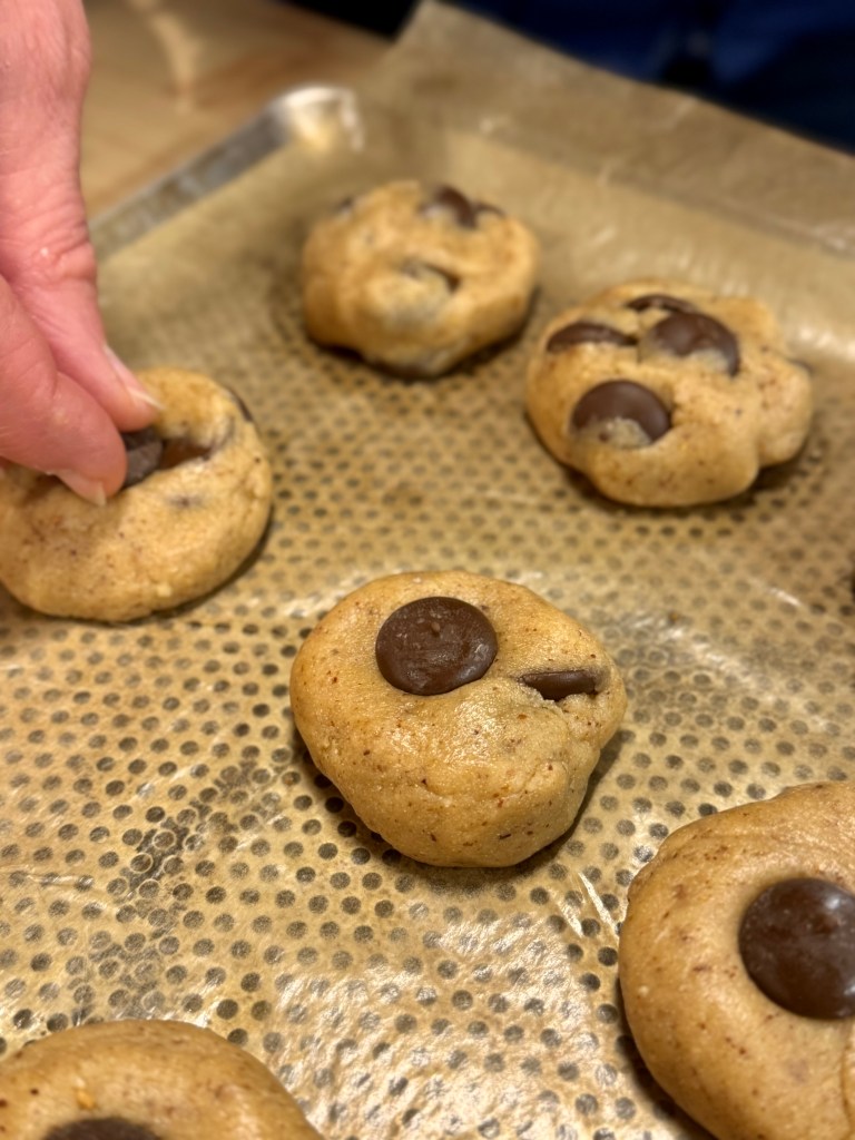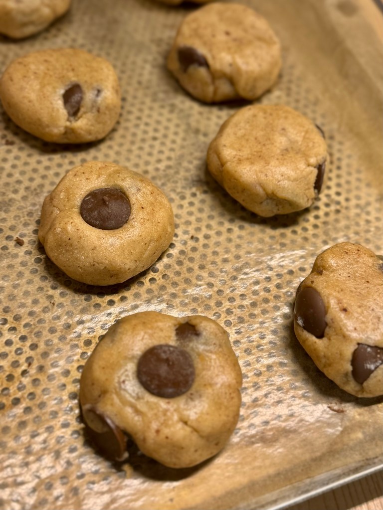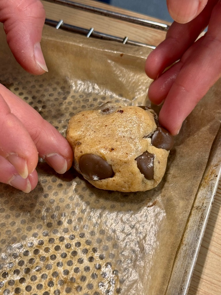 - Former des boules de pâte, les déposer sur une plaque de cuisson et les applatir légèrement du bout des doigts.