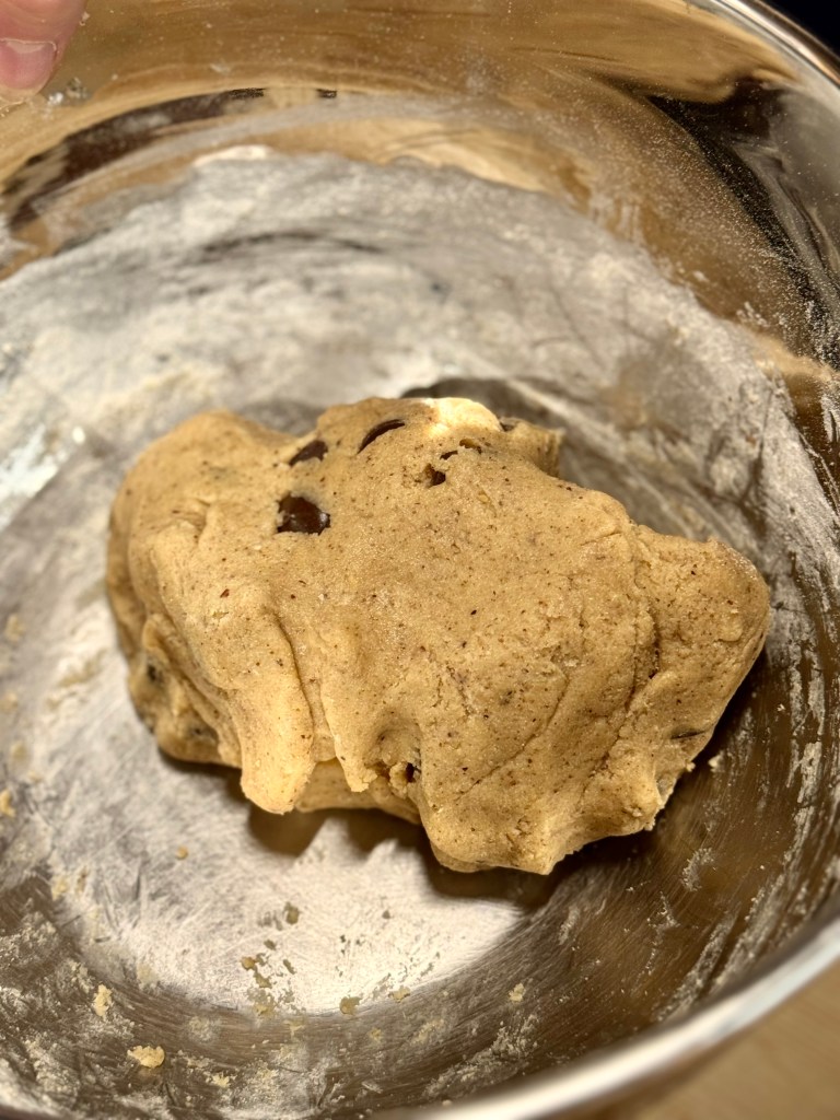 Tous les ingrédients sont amalgamés dans un cul-de-poule, puis transformés en cookies (n’hésitez pas à ajouter des pistoles sur le dessus de vos cookies). Quinze minutes au four et c’est prêt !