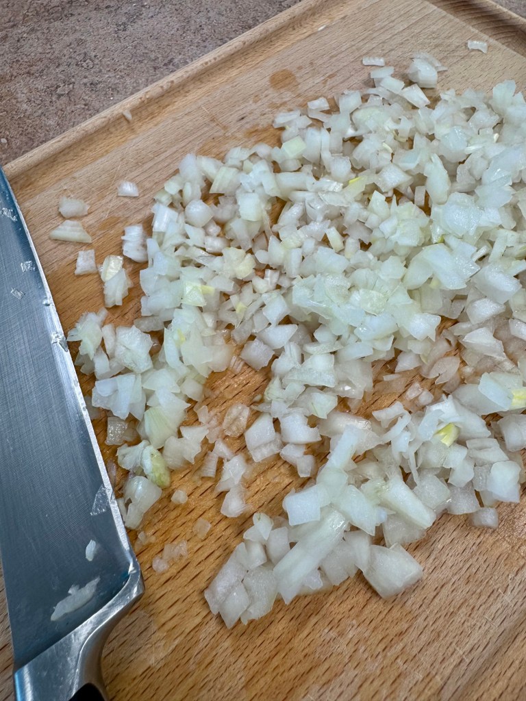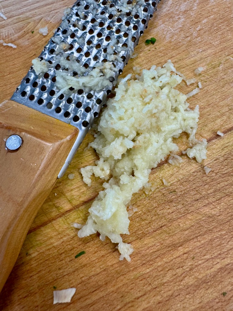 - Éplucher et émincer finement l’oigon, éplucher et râper l’ail, laver et ciseler le persil.