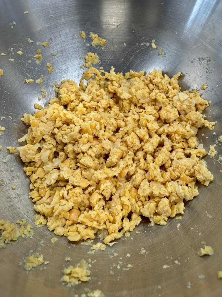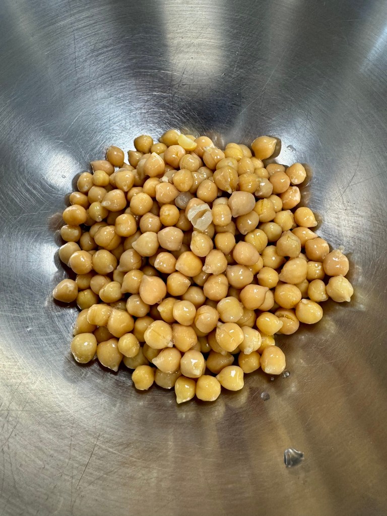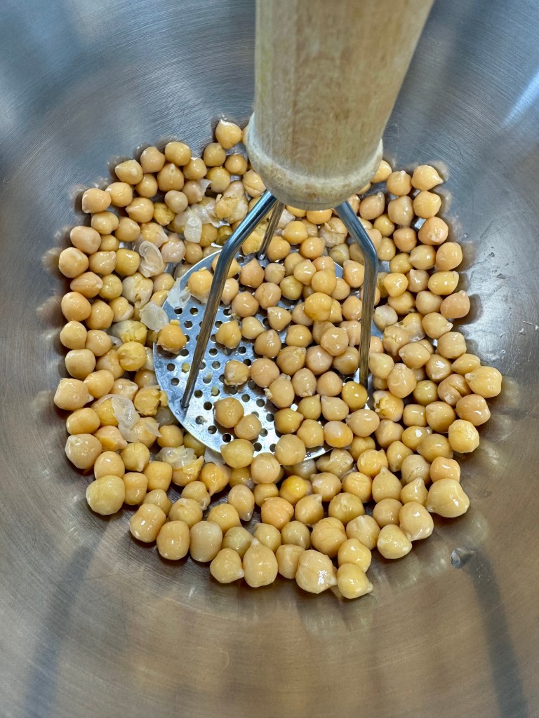 - Égoutter les pois chiches, les rincer et les écraser grossièrement dans un cul-de-poule.
