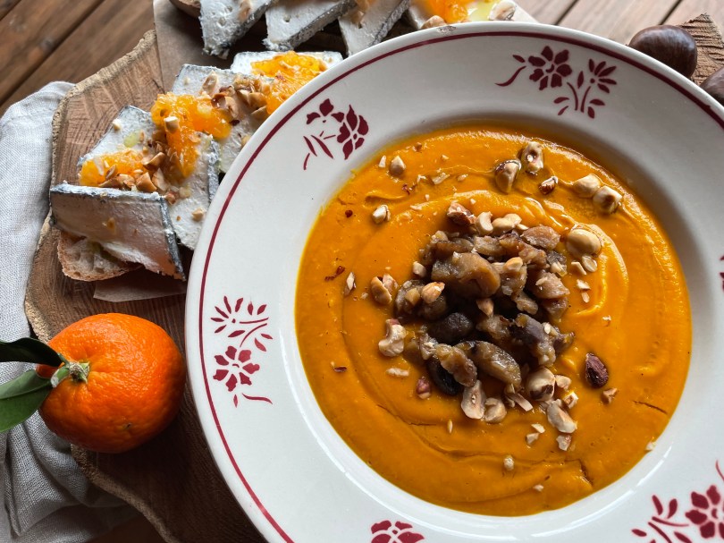 Soupe de potimarron à la clémentine et aux châtaignes, tartine de chèvre frais