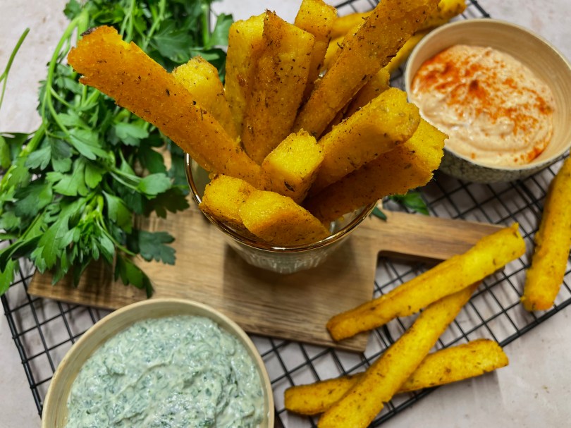 Je vous propose aujourd’hui une recette réinventée : de la polenta de maïs, somme toute très classique, transformée en frites au parmesan et accompagnée d’un duo de sauces verte et rouge.