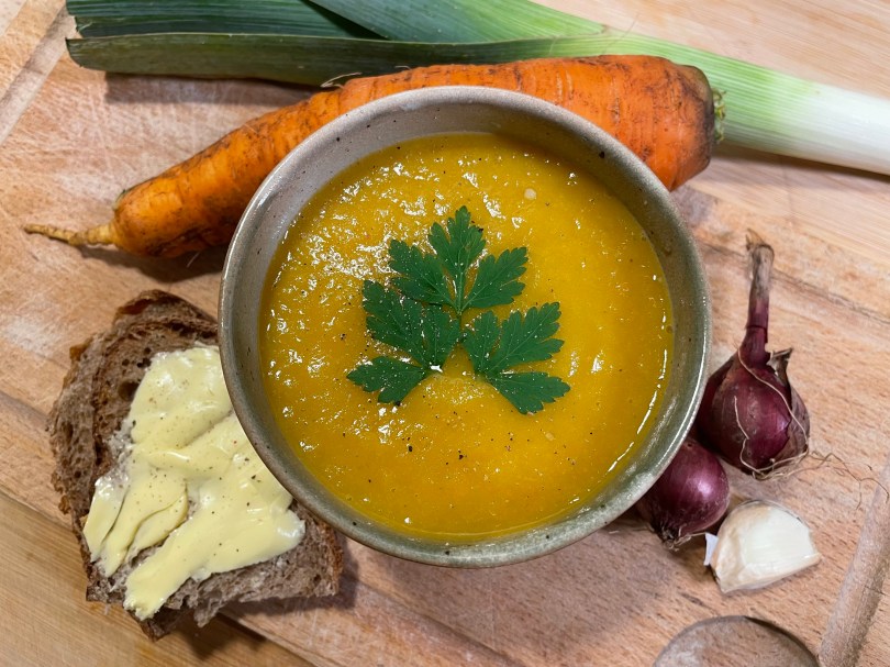 L’automne est bien là et il est grand temps de lui faire honneur cette année avec cette soupe de potimarron à la clémentine et aux châtaignes, accompagnée d’une tartine de chèvre frais aux noisettes grillées.