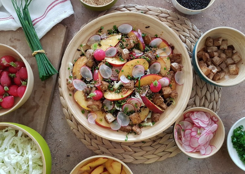 Aujourd’hui, je vous propose une salade estivale rafraîchissante à base de riz noir complet, de chou chinois, de courgette, de nectarines et de tofu frit déglacé à la sauce soja, le tout accompagné d’une sauce au tamari et au sirop d’érable !