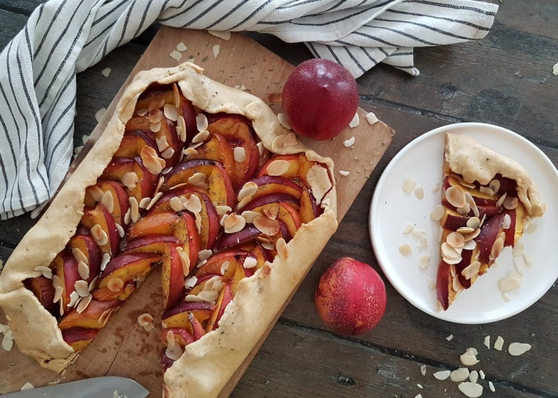 Cette semaine, je vous propose une recette bio qui me tentait depuis l’été dernier : une tarte rustique aux nectarines, au thym citronné et aux amandes (sans sucre ajouté), sur une base de pâte brisée au beurre demi-sel.