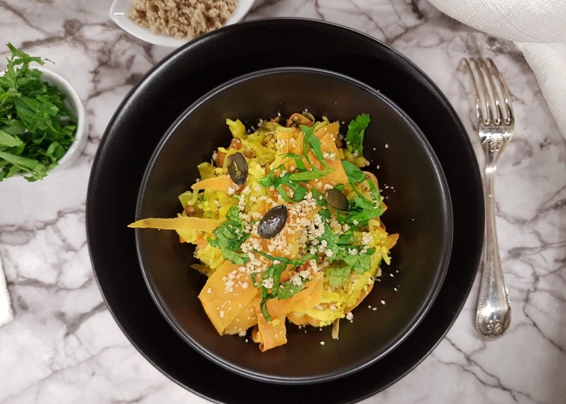 Chou-fleur rôti aux épices, lentilles corail et salade de chou rouge, pomme et noix