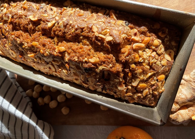 Carrot cake à la cannelle, aux noisettes grillées, à l’orange et au gingembre