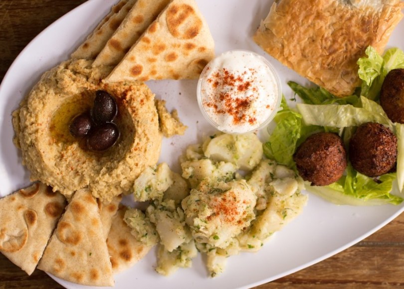 Falafels vegan, sauce au yaourt, houmous et pain pita