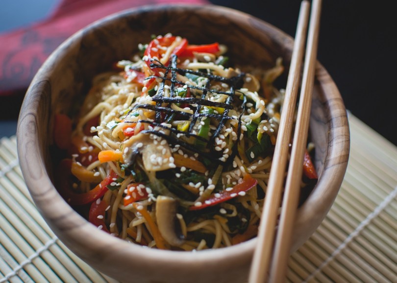 La version du pad thaï que je vous propose aujourd’hui est un tout petit peu différente : j’utilise bien évidemment le délicieux tofu fumé local du Chat des Champs, mais aussi des poivrons grillés maison que j’ai mis en bocal cet été et des champignons blonds.